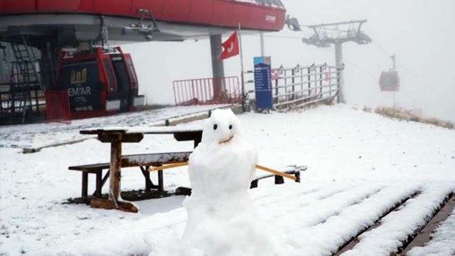 Ülkenin önemli kış turizmi merkezlerinden Erciyes Dağı'nda kar yağışı etkili oldu. Dağın 2 bin 200 metresine kadar etkisini gösteren kar yağışı zirveyi beyaza bürüdü. Öte yandan etkili olan kar yağışı sonrasında sezonun ilk kardan adamı da yapıldı.