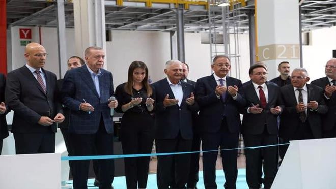 Cumhurbaşkanı Erdoğan konuşmasının ardından protokol mensupları ve işçilerle birlikte kurdela keserek fabrikayı hizmete açtı.