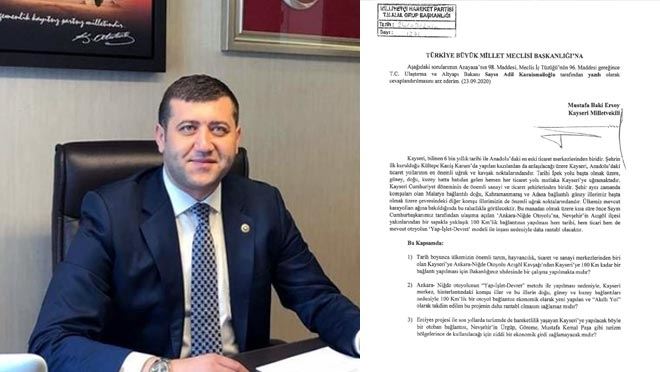 MHP Kayseri Milletvekili Baki Ersoy daha önce plan bütçe komisyonu bütçe görüşmelerinde de dile getirdiği Kayseri ilinin ‘otoyol’ problemini yeniden gündeme getirdi. Yıllardır yapımı Kayseri ve çevre iller tarafından dört gözle beklenen Ankara-Kayseri otoyolunun yapılacak yeni yatırımlar arasında bulunmaması üzerine MHP'li vekil Ulaştırma ve Altyapı Bakanı Adil Karaismailoğlu'a Kayseri'nin Ankara-Niğde otobanına bağlanması yönünde yazılı bir önerge sundu. Sunulan önergede; "Ankara-Nigde Otoyoluna, Nevşehir'in Acıgöl ilçesi yakınlarından bir sapakla yaklaşık 100 Km'lik bağlantının yapılması hem tarihi, hem ticari hem de mevcut otoyolun Yap-Işlet-Devret' modeli ile inşası nedeniyle daha rantabl olacaktır." İfadelerine yer veren Baki Ersoy, ayrıca Bakan tarafından yazılı olarak cevaplandırılması üzere;