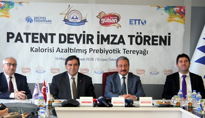 Erciyes Üniversitesi kendisine ait ´Kalorisi Azaltılmış Prebiyotik Kahvaltılık Modifiye Tereyağı´ adlı ürünün patenti, Türkiye´nin köklü ve önde gelen gıda firmalarından Gülsan Gıda San. Tic. A.Ş.´ye devir yoluyla ticarileştirildi. Erciyes Üniversitesi Teknopark toplantı salonunda yapılan patent devir teslim törenine Rektör Prof. Dr. Muhammet Güven, Gülsan A.Ş. Genel Müdürü Mehmet Güldüoğlu, ürün gelişimine katkı veren Prof. Dr. Mahmut Doğan ve üniversite yetkilileri katıldı.