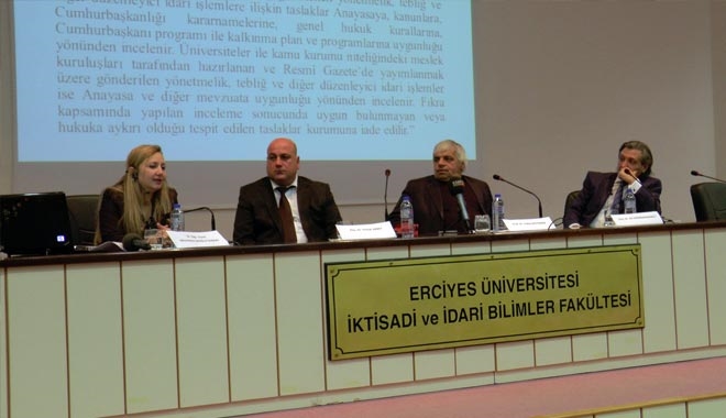 ERÜ İİBF Konferans Salonunda gerçekleştirilen panelin konuşmacıları, İİBF öğretim üyeleri Dr. Öğretim Üyesi Müzeyyen Eroğlu Durkal´ın yanı sıra, Doç. Dr. Ali Değirmendereli ve Doç. Dr. Ferhat Akbey, moderatörü ise Prof. Dr. Hakkı Büyükbaş oldu. Durkal, ?Normlar Hiyerarşisi´ başlıklı sunumunda, Cumhurbaşkanlığı Hükumet Sisteminde Cumhurbaşkanlığı kararnamesi olarak adlandırılan Kanun Hükmünde Kararlar (KHK), Cumhurbaşkanlığı kararları olarak adlandırılan Bakanlar Kurulu kararları ile tüzük ve yönetmeliklere dair bilgi verdi.