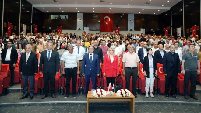 Erciyes Üniversitesi’nde (ERÜ) “15 Temmuz Demokrasi ve Milli Birlik Günü Anma Etkinlikleri” çerçevesinde Türkiye Şehit Yakınları ve Gaziler Dayanışma Vakfı Yönetim Kurulu Başkanı Bilge Gürs tarafından “15 Temmuz Gecesi Sergilenen Milli Duruş” konulu konferans verildi.