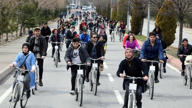 ERÜ Fen Fakültesi önünde başlayan bisiklet turuna bisikletçiler büyük ilgi gösterdi. Rektör Yardımcısı Prof. Dr. Recai Kılıç, burada yaptığı açıklamada 8 Mart Dünya Kadınlar Günü’nü kutladı. Erciyes Üniversitesi’nin yeşil bir kampüse sahip olduğuna dikkat çeken Rektör Yardımcısı Prof. Dr. Recai Kılıç, etkinliğin düzenlenmesinde emeği geçenlere teşekkür etti.