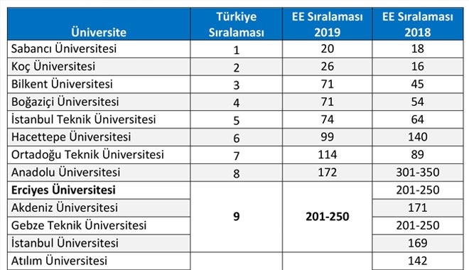 Erciyes Üniversitesi geçen yıla göre yerini koruyarak 201-250 bandında yer almak suretiyle önemli bir başarı göstermiştir. Erciyes Üniversitesi, bu sıralama listesinde ülke genelinde 9´uncu, devlet üniversiteleri arasında ise 6´ıncı olmuştur.