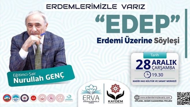 Kayseri Valiliği ve Kayseri Büyükşehir Belediyesi'nin de paydaşı olduğu ‘Erdemlerimizle Varız projesi’ çerçevesinde 'Edep Erdemi' konulu söyleşi düzenleyecek. Etkinlikte Şair Prof. Dr. Nurullah Genç 28 Aralık Çarşamba Günü saat 19.30’da Kayserililerle buluşacak.
