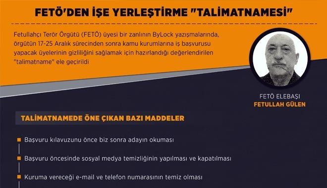 ByLock´ta örgüt üyeleri arasında 6 Ocak 2016´da paylaşıldığı belirlenen ve FETÖ´nün kamu kurumlarında iş başvurusu yapacak üyelerinin açığa çıkmaması için hazırlandığı değerlendirilen 14 maddelik talimatname "lisans ve ön lisans başvurularında dikkat edilmesi gerekenler" başlığını taşıyor.