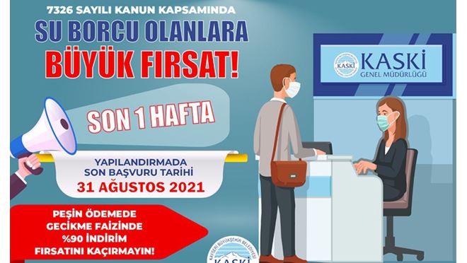 Kayseri Büyükşehir Belediyesi Su ve Kanalizasyon İdaresi Genel Müdürlüğü tarafından borcu olan aboneler için başlatılan yapılandırma fırsatında son 1 haftaya girildi. Buna göre peşin ödemede gecikme faizinde yüzde 90 oranında indirim uygulanacak yapılandırma fırsatında son başvuru tarihi 31 Ağustos Salı günü belirlendi.