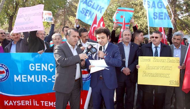 Genç-Memur Sen Kayseri İl Başkanı Mücahit Yıldız Bayırbucak Türkmenlerine destek amacıyla yaptığı basın açıklamasında, ?Bugün mazluma sahip çıkma günü. Esed´e, Putin´e, DAEŞ´e, İran´a ve zulme ortak olan bütün zalimlere, canilere ve vahşilere karşı olduğumuzu haykırma günü? dedi.