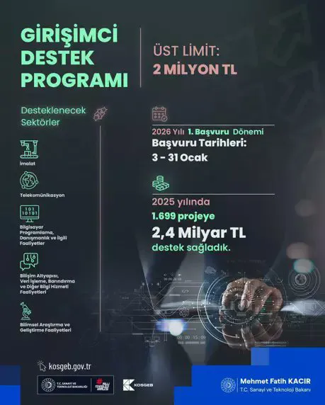 Bakanlık tarafından yapılan açıklamaya göre, destek programına başvurmak isteyen girişimcilerin 31 Ocak 2026 tarihine kadar başvurularını tamamlaması gerekiyor. Başvuruların ardından uygun bulunan projelere finansman desteği sağlanacak.