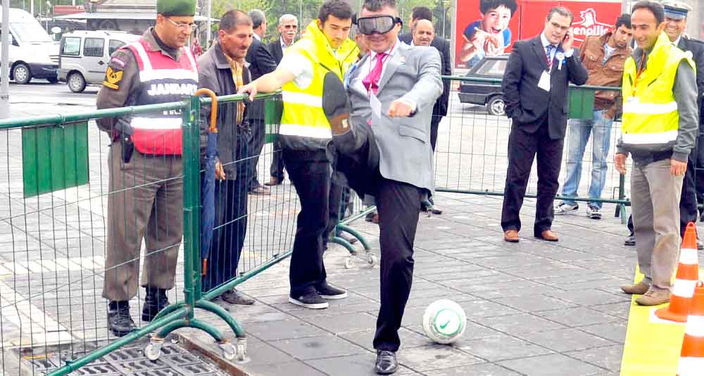 Gözlük takılıyken penaltı atışı yapması istenen bir vatandaş, topu göremedi. Emniyet Müdürü Cuma Ali Aydın da gözlüğü takarak, tekerlekli valizle dubaların arasından geçmeye çalıştı.