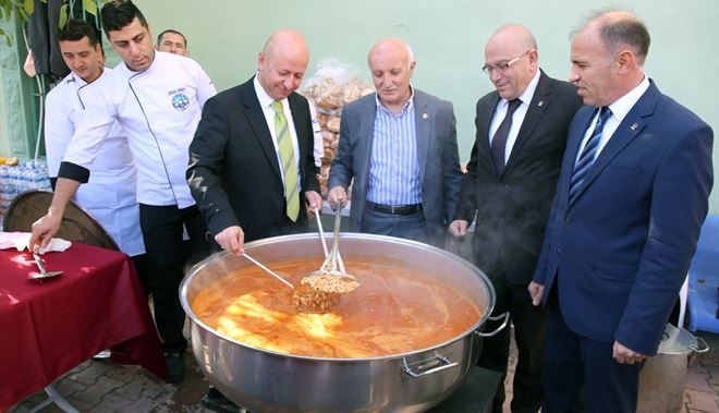 Gömeç Cami´nde kılınan Cuma Namazının ardından, meydanda kurulan sofralara geçen davetliler kazanlarca pişirilen eşsiz lezzet Gömeç Fasülyesi´nden yediler?.