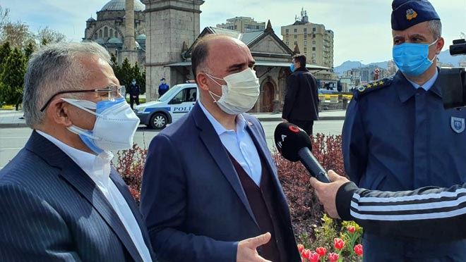 Kayseri Valisi Şehmus Günaydın ve Kayseri Büyükşehir Belediye Başkanı Memduh Büyükkılıç, sokağa çıkma kısıtlamasının 2. gününde Cumhuriyet meydanında yapılan denetimlere katıldı.