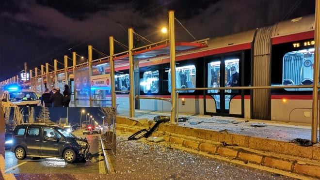 Kayseri'de iki hafif ticari aracın çarpışması sonucu meydana gelen trafik kazasında tramvay durağı zarar gördü.