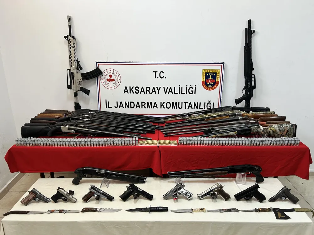 Adreslerde yapılan aramalarda 25 ruhsatsız av tüfeği, 8 ruhsatsız tabanca, 273 tabanca fişeği, 361 av tüfeği fişeği ve 8 kasatura ele geçirildi.