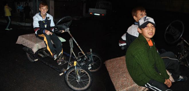 birlikte arabaya benzeyen bir bisiklet yaptı. Hurdacıdan 50 TL’ye aldıkları malzeme