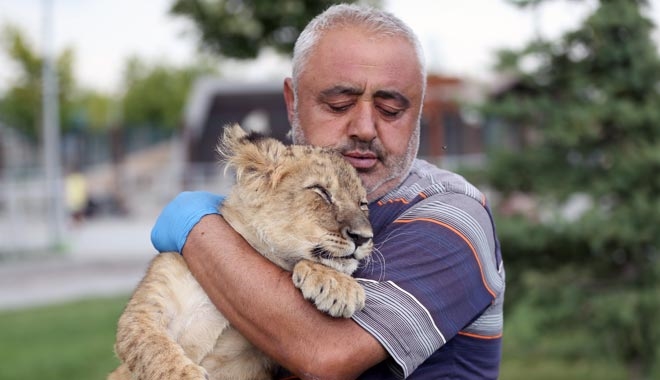 Kayseri Büyükşehir Belediyesi Hayvanat Bahçesi´nde görevli Adem Delioğlan, annesi tarafından kabul edilmeyen aslan yavrusu "Pusat"ı sahiplenerek baba şefkatiyle büyütüyor.