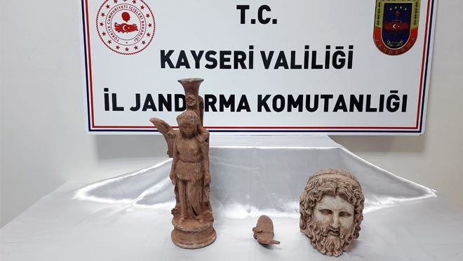 Edinilen bilgiye göre İl Jandarma Komutanlığı ekiplerince yürütülen asayiş faaliyetleri kapsamında; Kocasinan İlçesi Mevlana Mahallesinde ikamet eden V.A.'nın Roma dönemine ait olduğu değerlendirilen iki adet tarihi eser niteliği taşıyan heykeli 100 bin dolar karşılığında piyasaya sürmeye çalıştığı bilgisi alındı. Yapılan çalışmalarda V.A., heykellerle birlikte evinde yapılan arama sonucu yakalanarak gözaltına alındı.