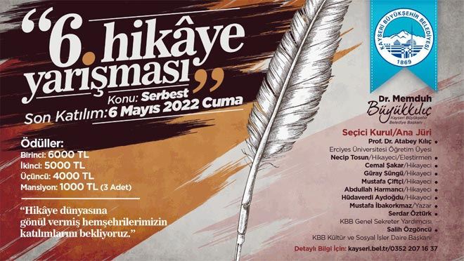 6.Hikâye Yarışması dereceye girenler listesi 27 Haziran’da Kayseri Büyükşehir Belediyesi’nin www.kayseri.bel.tr adresi üzerinden duyurulacak.