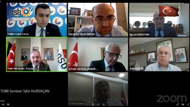 Mikro ve küçük ölçekli işletmelere teminatsız ve faizsiz geri ödemeli destek olarak açıklanan “Hızlı Destek Programı”nın anlatıldığı seminerin açılış konuşmasını OSBÜK adına Kayseri OSB Yönetim Kurulu Başkanı ve OSBÜK Yönetim Kurulu Üyesi Tahir Nursaçan yaptı. Program, zoom ve TOBB’un sosyal medya hesaplarından canlı olarak yayınlanan ektinlikte TOBB Yönetim Kurulu Üyesi Zeki Kıvanç’ın ardından OSBÜK adına konuşan OSBÜK Yönetim Kurulu Üyesi ve Kayseri OSB Yönetim Kurulu Başkanı Tahir Nursaçan, OSBÜK’ün; OSB’ler arasındaki işbirliği ve dayanışmayı temin etmek, Bakanlık ile OSB’ler arasındaki koordinasyonu sağlamaktan sorumlu olduğunu kaydetti.