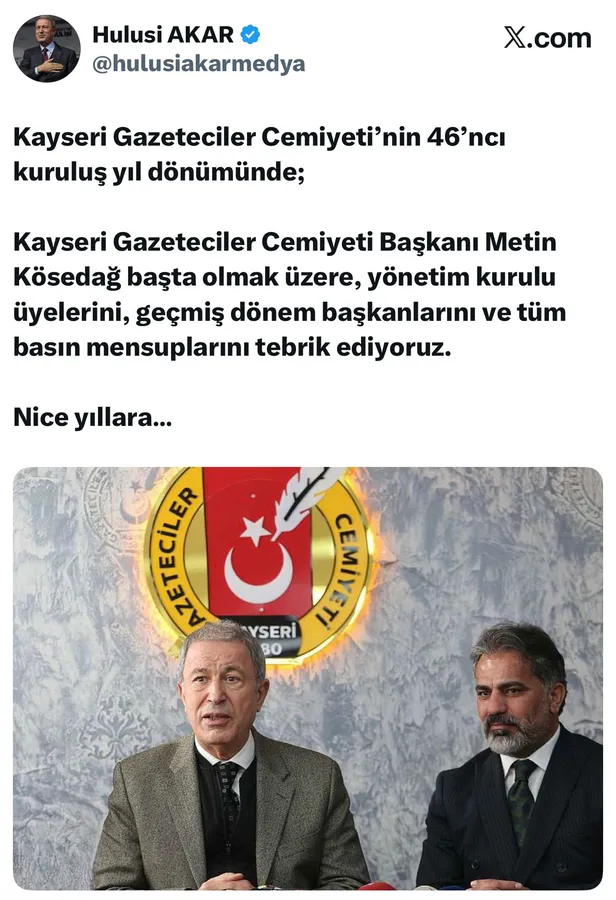 AK Parti Kayseri Milletvekili Hulusi Akar, Kayseri Gazeteciler Cemiyeti’nin 46’ncı kuruluş yıl dönümü dolayısıyla bir tebrik mesajı yayımladı. Akar, sosyal medya hesabı üzerinden yaptığı paylaşımda, Kayseri Gazeteciler Cemiyeti Başkanı Metin Kösedağ başta olmak üzere cemiyet yönetim kurulu üyelerini, geçmiş dönem başkanlarını ve tüm basın mensuplarını kutladı.