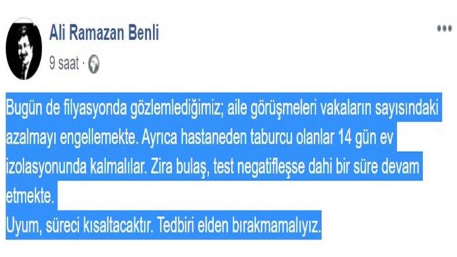 İl Sağlık Müdürü Doç. Dr. Ali Ramazan Benli, korona virüs salgınında filyasyon çalışmalarında aile görüşmelerinin vakaların sayısının azalmasını engellediğini ifade etti. Doç.Dr. Benli, sosyal medya hesabından yaptığı paylaşımda, "Bugün de filyasyonda gözlemlediğimiz; aile görüşmeleri vakaların sayısındaki azalmayı engellemekte. Ayrıca hastaneden taburcu olanlar 14 gün ev izolasyonunda kalmalılar. Zira bulaş, test negatifleşse dahi bir süre devam etmekte.