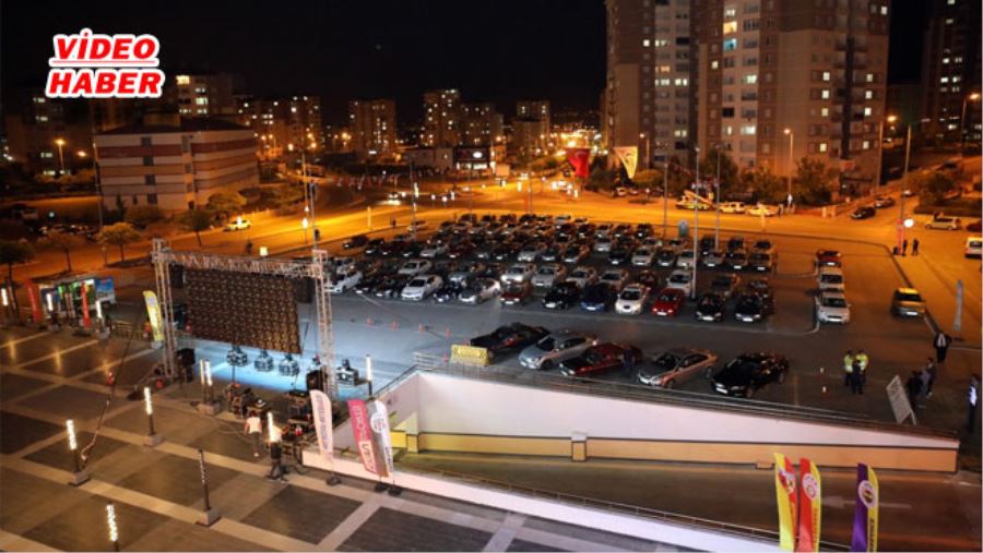İldem'de Kaysermall AVM otoparkında gerçekleştirilen etkinliğe araçları ile gelen vatandaşlar kurulan dev ekranın önüne araçlarını park ederek Türk sinemasının sevilen filmlerini izliyor.