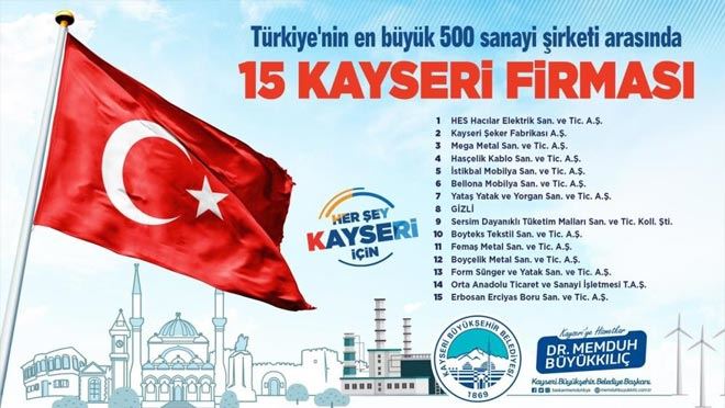 “Türkiye’nin en büyük 500 sanayi şirketi arasına giren HES Hacılar Elektrik San. ve Tic. A.Ş firmamız başta olmak üzere; Kayseri Şeker Fabrikası, Mega Metal San. ve Tic. A.Ş. , Hasçelik Kablo San. ve Tic. A.Ş. , İstikbal Mobilya San. Ve Tic. A.Ş. , Bellona Mobilya San. ve Tic. A.Ş. , YATAŞ Yatak ve Yorgan San. Tic. A.Ş ,Sersim Dayanıklı Tüketim Malları San ve Tic. Koll. Şti İbrahim ve Mustafa Usluoğlu, Boyteks Tekstil San. ve Tic. A.Ş. , Femaş Metal San. ve Tic. A.Ş. , Boyçelik Metal San. ve Tic. A.Ş. , Form Sünger ve Yatak San. Tic. A.Ş. ,Orta Anadolu Ticaret ve Sanayi İşletmesi T.A.Ş., ERBOSAN Erciyas Boru San. ve Tic. A.Ş. olmak üzere 15 Kayseri firmamızı can-ı gönülden tebrik ediyorum. Sanayide çok önemli markalara ve önemli üretim potansiyeline sahibiz. Kentimiz sanayinin ve ticaretin merkezi olmaya devam edecek. Bu başarıda emeği geçen herkese teşekkür ediyorum.”