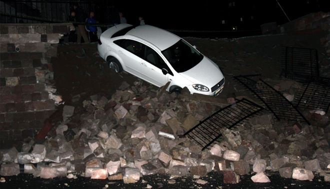 Kayseri´de yağmur nedeniyle bir binanın istinat duvarı yıkıldı. Park halindeki otomobil duvarın yıkılmasıyla aşağı düştü.