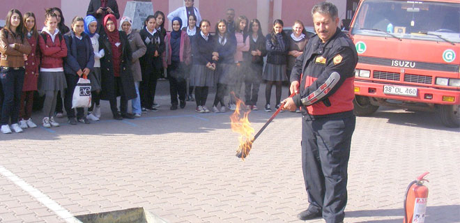 Öğretmen ve öğrencilere önce teorik eğitim verilerek yangın anında yapılması gerekenler anlatıldı. Daha sonra okul bahçesinde ateş yakılarak yangına müdahale uygulamalı olarak gösterildi. Öğretmen ve öğrenciler yangın söndürme tüpü kullanarak yangına müdahale konusunda tecrübe edinmiş oldular.
