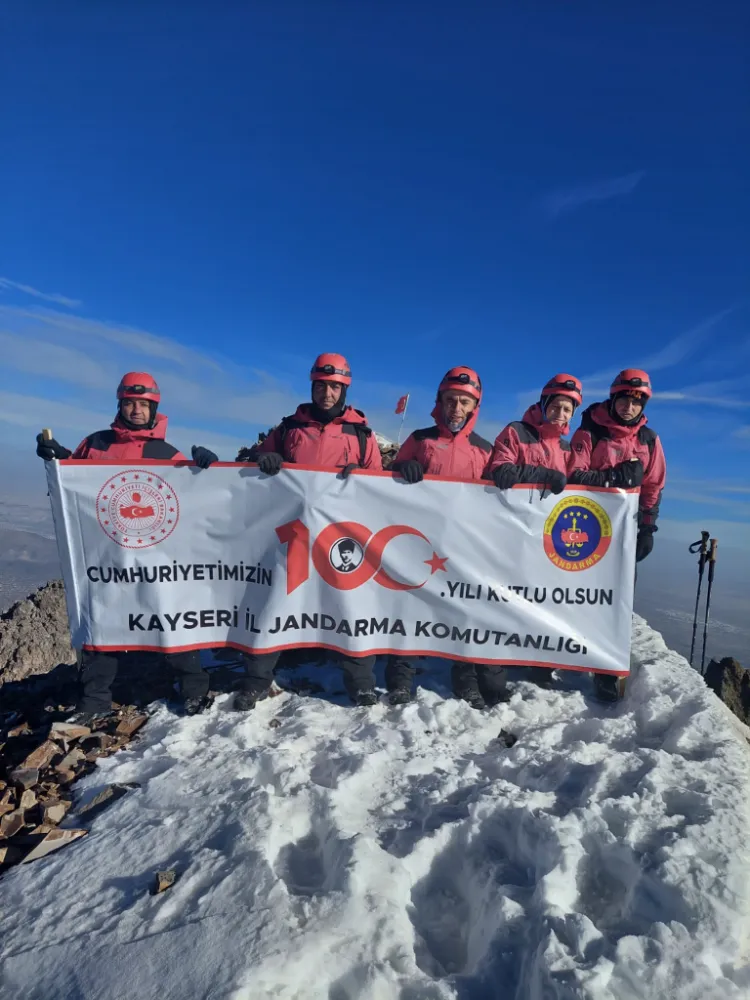 Cumhuriyetin 100.yılı dolayısıyla Kayseri İl Jandarma Komutanlığı JAK Tim Komutanlığınca Erciyes Dağı'na zirve tırmanışı gerçekleştirdi. Zirve tırmanışını tamamlayan ekipler; "Cumhuriyetimizin 100. yılı kutlu olsun" mesajı verdi.