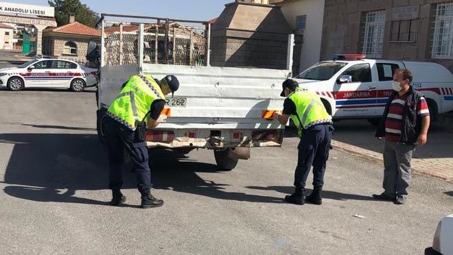Traktör sürücüleri jandarmanın da yardımıyla verilen üçgen reflektörleri römorklarına taktı.