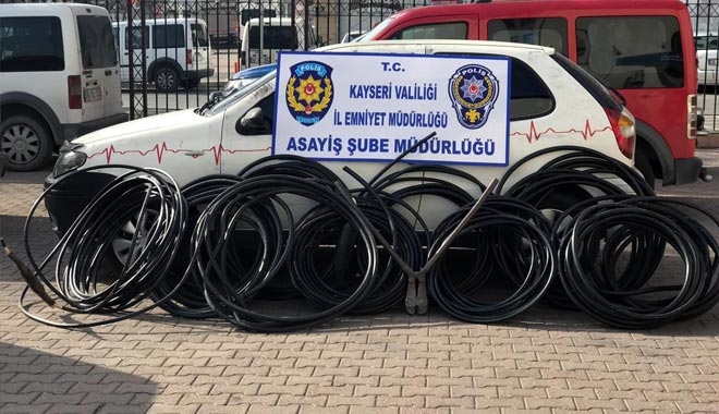 Edinilen bilgiye göre kentte meydana gelen kabloların kesilerek çalınması olaylarında son dönemlerde yoğunluk yaşanması üzerine Hırsızlık Büro amirliğince çalışma başlatıldı. Oluşturulan 2 ekip ile şüpheli şahıslar tespit edilerek fiziki takibe alındı. Yapılan çalışmalarda şüpheli T.K. (36) ve K.K. (31) çaldıkları kabloları Ankara yolu 25. kilometre Molu Köyü köpek barınağı yakınlarındaki boş bir arazide yakarak hurdacılara sattıkları tespit edildi. Germir Mahallesi Mezarlık yanında yeraltı kablolarının kesilerek çalınması üzerine Molu Köyü yakınlarında boş araziye ekipler pusu attı. Araçla gelen 3 şahıs, ekipler tarafından yakalanırken, araçta yapılan incelemede büyük boy kesme makası ile 10 parça halinde 263 metre kablo elde geçirildi.