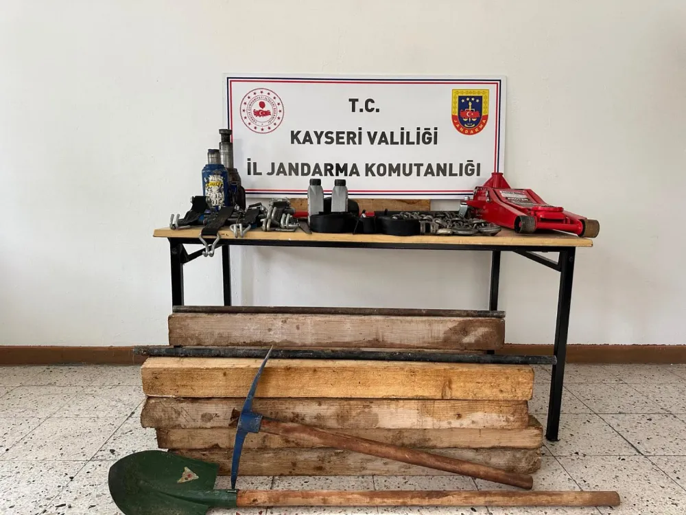 Olay yerinde, ayaklı kriko, murç, el testeresi, pense, kancalı bağlama zinciri, kazma, kürek ve yük taşımada kullanılan malzemeler ele geçirildi.