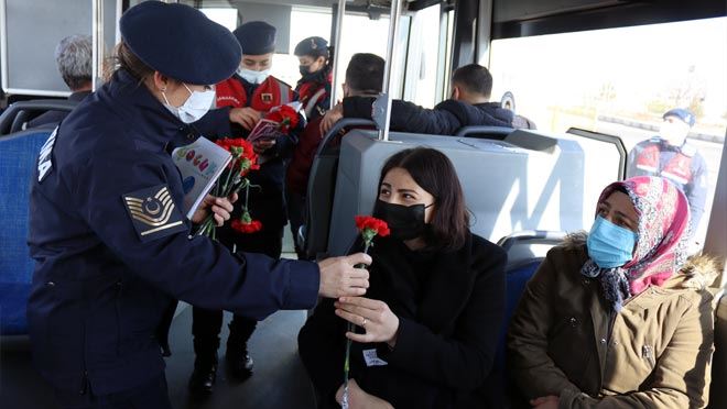 İl Jandarma Komutanlığı’nın kadın personelleri 8 Mart Dünya Kadınlar Günü vesilesi ile kadın yolculara karanfil dağıtıp, Kadın Destek Programı – KADES’i tanıttılar.