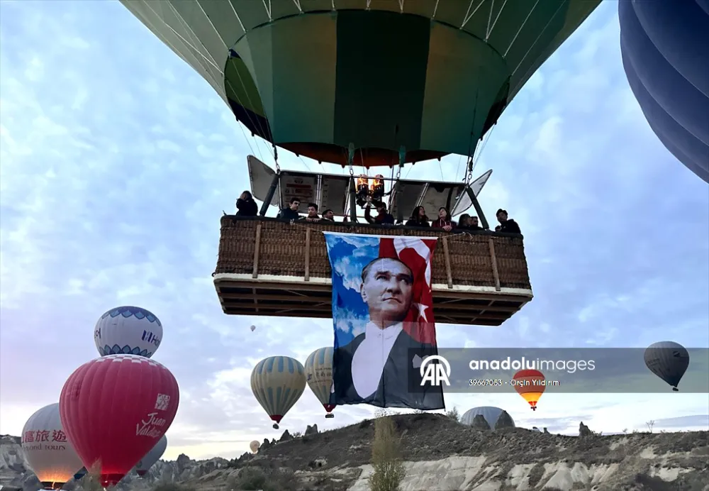 Nevşehir'in Göreme beldesindeki sıcak hava balonları kalkış alanında, turistlere yönelik tur için hazırlanan balon sepetlerine, "10 Kasım Atatürk'ü Anma Günü"nde Türk bayrakları ve Atatürk posterleri asıldı.