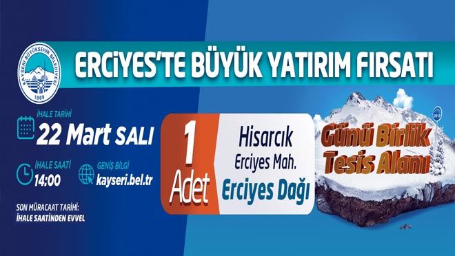 Mülkiyeti Kayseri Büyükşehir Belediyesi'ne ait olan, Melikgazi İlçesi, Hisarcık-Erciyes Mahallesi, 8899 ada, 1 parselde bulunan Günü Birlik Tesis Alanı ihalesi 22 Mart 2022 Salı günü saat 14.00’te Büyükşehir Belediyesi Encümen Salonu’nda gerçekleştirilecek.