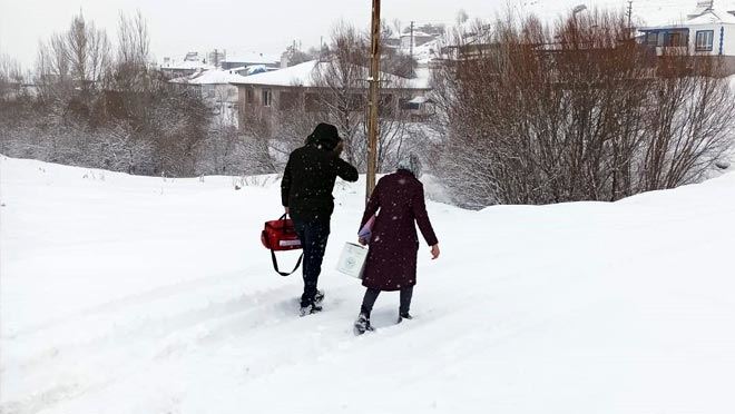MHRS'den randevu alan 65 yaş ve üstü vatandaşların adreslerine kar yağışı altında giden ekipler zorluklara rağmen korona virüsle mücadelelerini sürdürüyor.