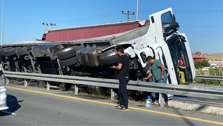 Edinilen bilgiye göre Kayseri Kuzey Çevre Yolu'nda Ankara'dan Sivas istikametine giden Kemal A.'nın kullandığı karton yüklü tır, demir bariyerlere çarparak yan yattı. Sürücünün yara almadan kurtulduğu kazada, trafik polisi ekipleri olay yerinde ikinci kazanın olmaması için önlem aldı.