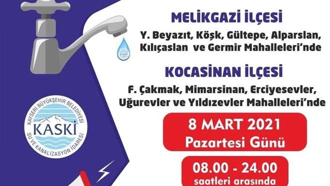 KASKİ’den yapılan açıklamada, bu kapsamda hat bağlantı çalışmalarının yapılabilmesi için 8 Mart 2021 Pazartesi günü 08.00 ile 00.00 saatleri arasında, Melikgazi ilçesi, Yıldırım Beyazıt, Köşk, Gültepe, Alparslan, Kılıçaslan ve Germir Mahalleleri’nde, Kocasinan ilçesi, Fevzi Çakmak, Mimarsinan, Erciyesevler, Yıldızevler ve Uğurevler Mahalleleri’nde su kesintisi yaşanacağı belirtildi.