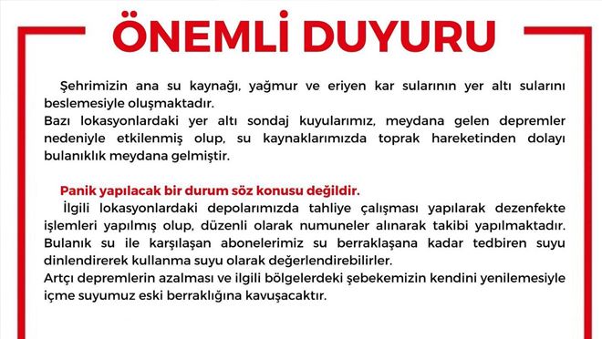 “Şehrimizin ana su kaynağı, yağmur ve eriyen kar sularının yer altı sularını beslemesiyle oluşmaktadır. Bazı lokasyonlardaki yer altı sondaj kuyularımız, meydana gelen depremler nedeniyle etkilenmiş olup, su kaynaklarımızda toprak hareketinden dolayı bulanıklık meydana gelmiştir. Bu durumdan Talas ilçemizde Yukarı, Kiçiköy, Yenidoğan, Mevlana, Harman, Bahçelievler, Tablakaya Mahalleleri, Melikgazi ilçemizde Erenköy, Demokrasi, Bahçelievler, Kılıçaslan, İldem-TOKİ, Battalgazi, Esenyurt, Kıranardı Mahalleleri, Kocasinan ilçemizde Erkilet ve Kocasinan Mahalleleri, Develi ilçemizde ise Camicedit, Aşık Seyrani, Mehmet Akif, Aşağı Everek, Bahçelievler, Yeni, Harman, Yeni Hayat, Mustafa Asım Köksal Mahalleleri etkilenmiştir. İlgili lokasyonlardaki depolarımızda tahliye çalışması yapılarak dezenfekte işlemleri yapılmış olup, düzenli olarak numuneler alınarak takibi yapılmaktadır. Bulanık su ile karşılaşan abonelerimiz su berraklaşana kadar tedbiren suyu dinlendirerek kullanma suyu olarak değerlendirebilirler. Artçı depremlerin azalması ve ilgili bölgelerdeki şebekemizin kendini yenilemesiyle içme suyumuz eski berraklığına kavuşacaktır. Panik yapılacak bir durum söz konusu değildir. Kamuoyuna saygılarımızla.”
