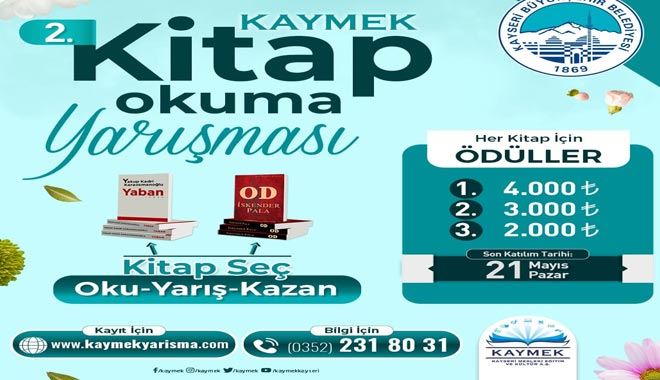 Büyükşehir Belediyesi bünyesinde faaliyetlerini yürüten KAYMEK, Başkan Dr. Memduh Büyükkılıç liderliğinde kitap sevdalılarına ödüllü kitap okuma yarışması etkinliği sunuyor. Büyükşehir Belediyesi, geleneksel hale getirdiği yarışmalarla bireylerin düşünce ve ifade dünyalarını zenginleştirmeyi amaçlıyor. Bu kapsamda “Kitap Seç, Oku, Yarış, Kazan” sloganıyla düzenlenen yarışmanın 2.sini düzenleniyor.