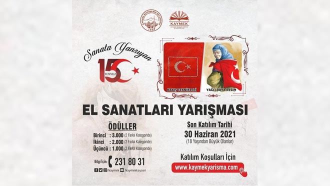 Büyükşehir Belediyesi, Kayseri Mesleki Eğitim ve Kültür A.Ş. (KAYMEK) tarafından düzenlenen 15 Temmuz'un millî ve manevi ruhunu yansıtan yağlı boya resim ve nakış teknikleri sanatlarının yer alacağı ‘Sanata Yansıyan 15 Temmuz El Sanatları’ yarışmasına başvurular başladı.