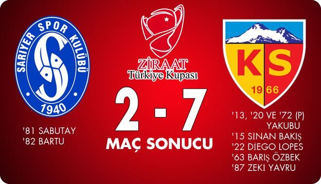 Ziraat Kupası 3.Tur maçları sürüyor. Kayserispor, 3.tur mücadelesinde Sarıyer ile karşı karşıya geldi.Mücadeleyi 7-2 kazanan Kayserispor, kupada tur atlayan taraf oldu.