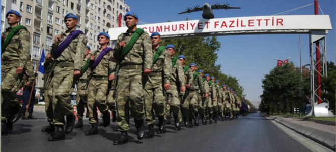 Bu arada askeri jipler üzerindeki kamuflajlı keskin nişancılar ile paraşütçü komando geçişi de ilgiyle izlendi.