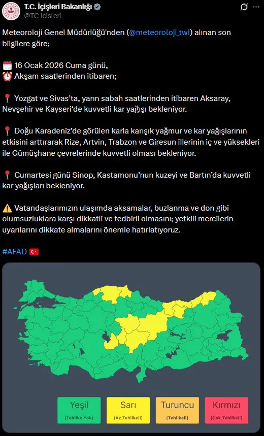 İçişleri Bakanlığı, Meteoroloji Genel Müdürlüğü’nden alınan son verilere göre 16 Ocak Cuma günü akşam saatlerinden itibaren Kayseri’de ve birçok ilde kuvvetli kar yağışı beklendiğini açıkladı. Paylaşımda, özellikle ulaşımda aksamalar, buzlanma ve don riskine karşı vatandaşların dikkatli ve tedbirli olması istendi. Yetkililer, resmi uyarıların yakından takip edilmesi gerektiğini vurguladı.
