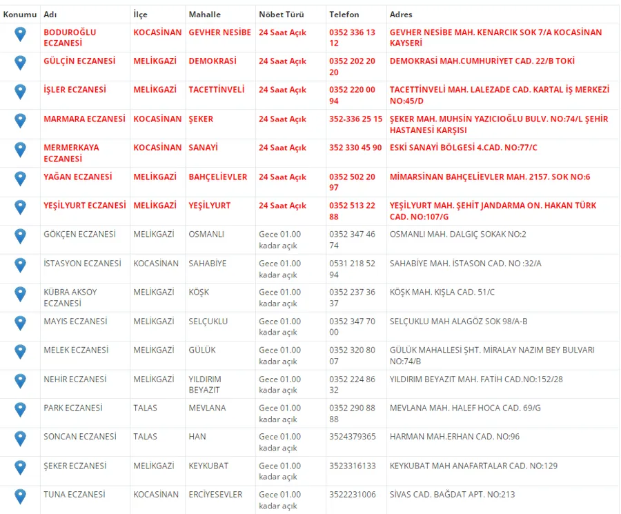 Kayseri'de vatandaşların acil sağlık ihtiyaçları için nöbetçi eczaneler önemli bir yere sahip. Kayseri’nin bugünkü nöbetçi eczanelerini sizler için derledik. 15 Kasım Cumartesi nöbetçi eczaneler listesine buradan ulaşabilirsiniz. İşte 15 Kasım nöbetçi eczaneler…