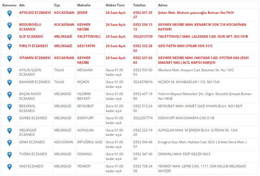 Kayseri'de vatandaşların acil sağlık ihtiyaçları için nöbetçi eczaneler önemli bir yere sahip. Kayseri’nin bugünkü nöbetçi eczanelerini sizler için derledik. 21 Ekim Salı nöbetçi eczaneler listesine buradan ulaşabilirsiniz. İşte 21 Ekim nöbetçi eczaneler…