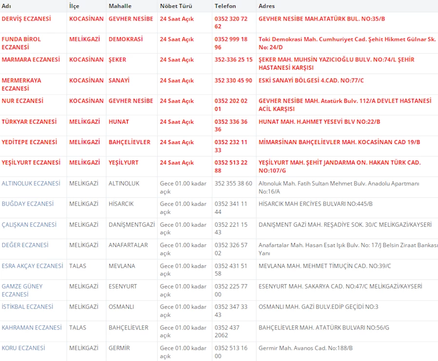 Öte yandan nöbetçi eczaneler, anlık üşütme, zehirlenme vakaları veya ilaçların yan etkileri gibi acil sağlık sorunlarına da müdahale etme konusunda da yetkinlik sahibi olurken, bugünkü nöbetçi eczaneleri sizler için derledik. Kayseri'de bugün hangi nöbetçi eczaneler açık?