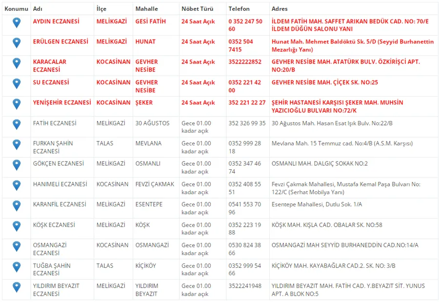 Kayseri'de vatandaşların acil sağlık ihtiyaçları için nöbetçi eczaneler önemli bir yere sahip. Kayseri’nin bugünkü nöbetçi eczanelerini sizler için derledik. 2 Aralık Salı nöbetçi eczaneler listesine buradan ulaşabilirsiniz. İşte 2 Aralık nöbetçi eczaneler…