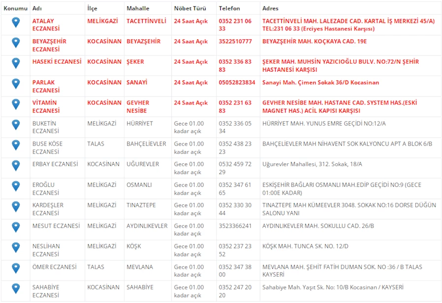 Kayseri'de vatandaşların acil sağlık ihtiyaçları için nöbetçi eczaneler önemli bir yere sahip. Kayseri’nin bugünkü nöbetçi eczanelerini sizler için derledik. 2 Nisan Çarşamba nöbetçi eczaneler listesine buradan ulaşabilirsiniz. İşte 2 Nisan nöbetçi eczaneler…